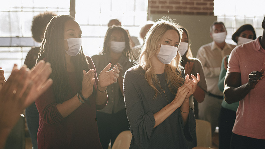 A business party in new normal with crowded people wearing masks